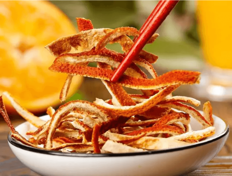 陈皮性温、味辛、苦,归脾、胃、肺经,具有理气开胃、消胀止呕、燥湿化痰等功效。中医利用陈皮促进食欲,缓解胸腹部胀满不适、呕吐、胸闷等症状。陈皮还可以化痰止咳。