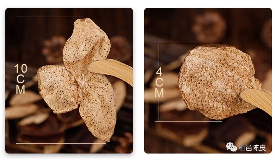 须知新会陈皮本身就陈久者良,随着时间的沉淀,含水量会逐年降低,陈化时间越久,皮身越轻、薄、脆,容易发生断裂,所以新会陈皮若经过数十年的陈化,形状仍为三瓣完整无缺,可谓难得。若是其中的一瓣碎开,变成单瓣或双瓣的一片就是陈皮碎片,常被称作“角皮”、“碎皮”、“单片皮“等,碎皮的产生与多种因素有关,但与完整的新会陈皮相比,本质上没有太大的区别,不会影响功效作用。