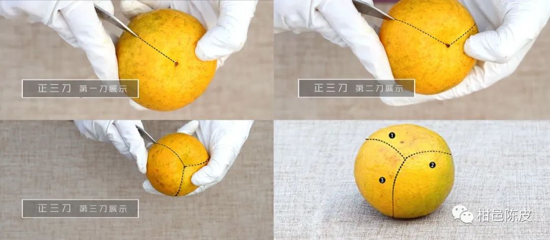 开皮时将柑果果蒂朝下,从果顶向果蒂纵划三刀,留果蒂部相连,正三瓣剥开柑皮。这种方式的优点是柑皮三瓣较均匀对称,缩减存储空间;缺点是正三刀法一般为手工开皮,效率方面有待提升。