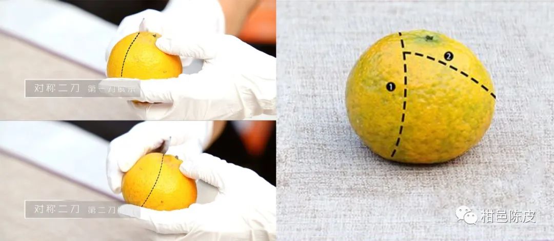 开皮时将柑果果蒂朝上,从果肩两边对称反向弧划两刀,留果肩顶部相连,三瓣剥开柑皮。这种方式的优点是节约步骤,省工省时;缺点是三瓣反卷每瓣大小会有所不同,外形不够美,并且需用较大的空间来储存同样重量的皮。